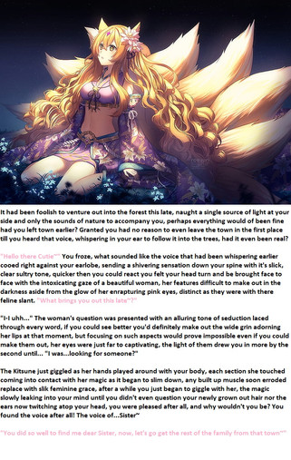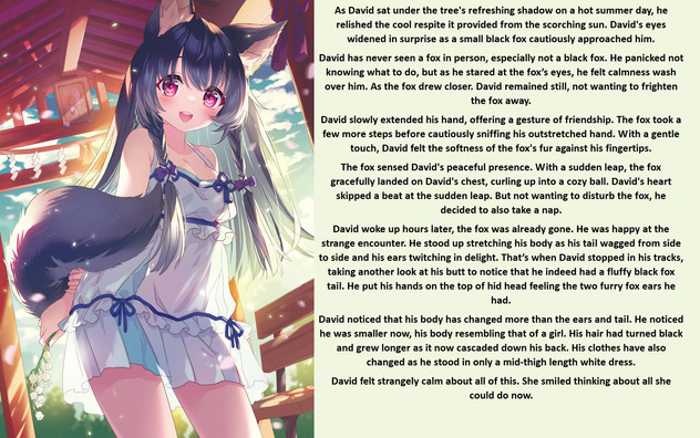 Carl collapsed to the ground floating in and out of consciousness. This was something he had not been warned about. Perhaps they did not even know kitsune had such powers, but Carla did. Carla woke the next morning as a kitsune ready to pull pranks on unsuspecting travelers.