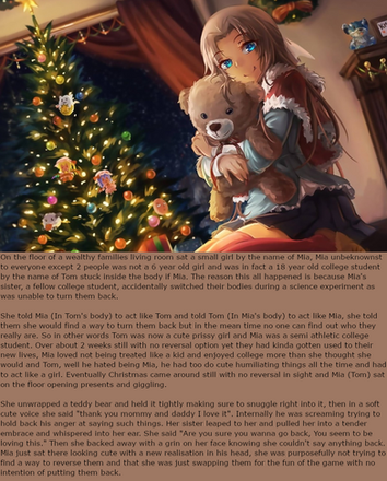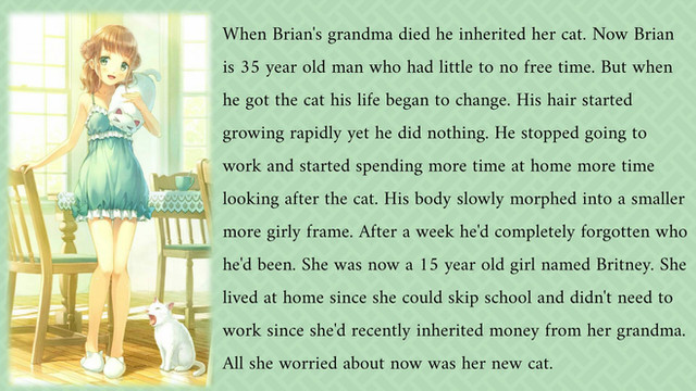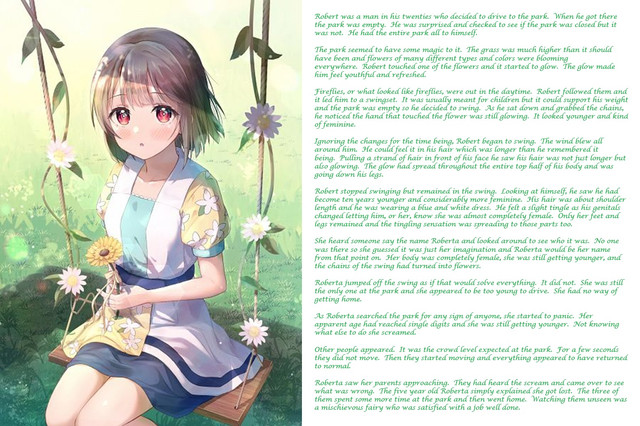The changes were not yet done. The rest of his body changed too. Most of his body hair disappeared leaving only the amount found on a child. His male body parts disappeared and were replaced by female ones. It did not take long for him, or her, to realize she had become the girl in the photo.