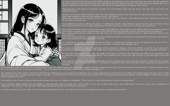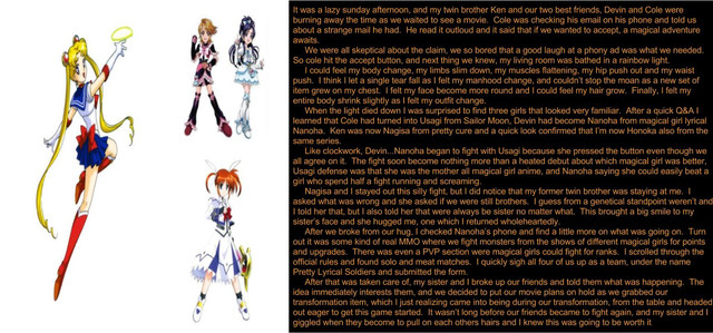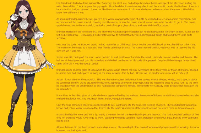 His hair turned blond and grew down to just above his neck. This caused him to blink and when he did his eyes turned blue. He decreased in size until he was the size of a ten year old girl. His clothing changed into a light blue blouse and yellow dress, just like the girl in the photo. Then a large pink bow appeared in his hair.