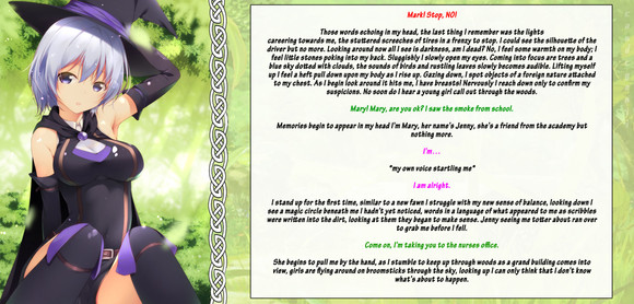 She (as far as he was concerned) entered the school for her first day of classes. The first few minutes were spent meeting new people. Then she had to go to class. Her teachers taught her a few spells which were surprisingly easy to master. She found herself well on her way to success.
