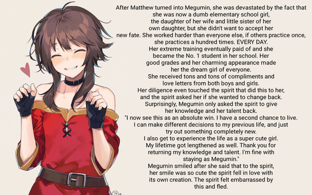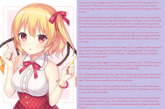 He ended up as an attractive young girl with red hair and blue eyes. It was quite impressive for a random selection, almost as if by magic. Upon seeing the results, Emerson wished he could be with this character instead of be this character. That did not last long. The hypnosis took its effect and he basically thought of himself as what was his ideal dream girl.