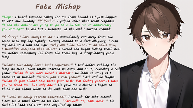 Amara, formerly Otto, arrived at Magical Surprise Restaurant a little early. She certainly did not want to be late for something like this. Otto, formerly Amara, was already there. They talked to each other explaining their past and what they had done that day. At precisely 6:30 P.M. their meal was delivered to them. The food was indeed good as expected.