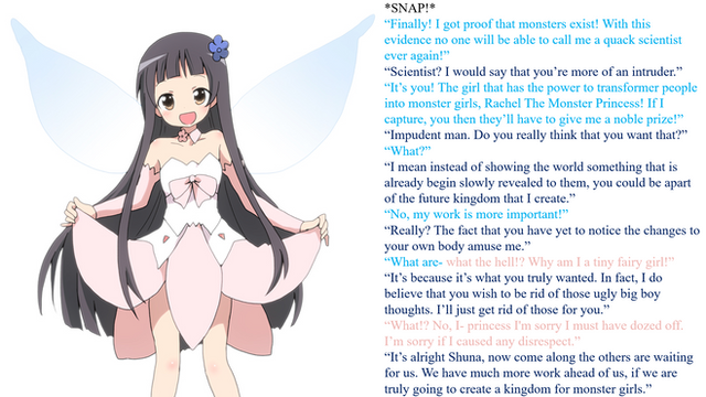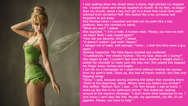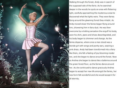 Instead of his doom, something else happened. He saw lights dancing all around him. His body grew smaller and became more feminine. Other changes were also happening. His clothing changed into a bright blue dress with matching shoes, his hair grew below his waist, and wings sprouted out of his back.