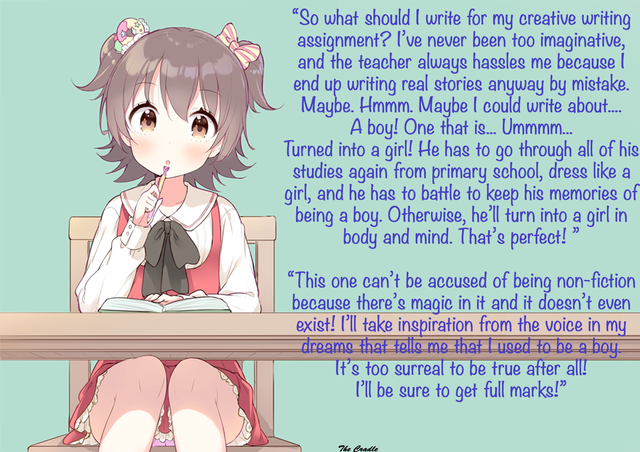 His body became much smaller. Mouse ears appeared on his head and a tail grew out of him. His clothing changed into a blouse and skirt with matching shoes and socks. The human ears he once had disappeared as they were covered up by his growing hair which stopped at his shoulders. His entire body changed from a boy into a girl, a mouse girl.