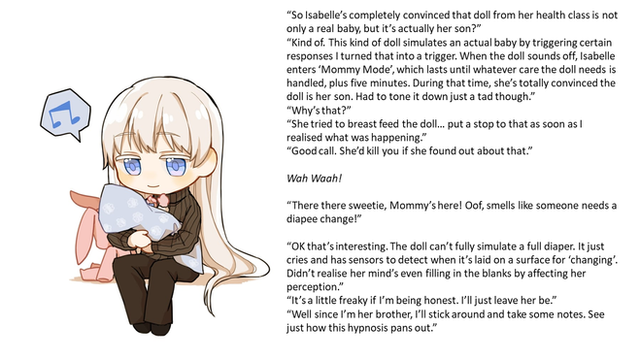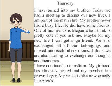Jessie placed the virtual reality visor over his eyes. Through the visor he could see "her" body. Then he was asked if he wanted to use the optional hypnosis feature. He did not even hesitate. He wanted the full experience. It did not take long for "her" to think "she was the character he had created.