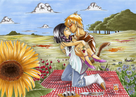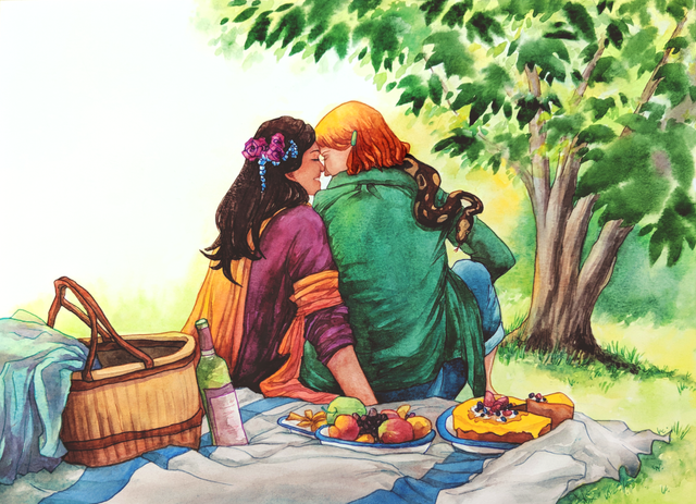 C.S. Notes: Another fun painting featuring two of my favorite human characters, Anna, to the left, and Sandra, right. These two make such a lovely couple, Sandra is a stubborn tom boy who dresses in jean jackets and leather, while, Anna, blind - prefers dresses and sun hats.