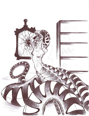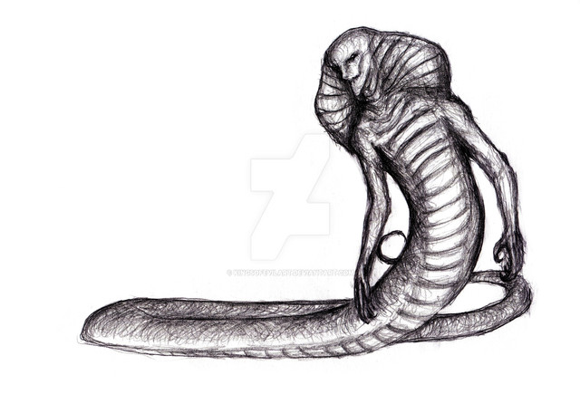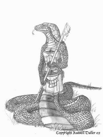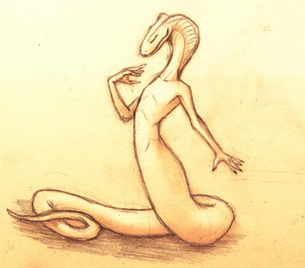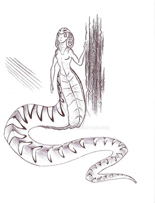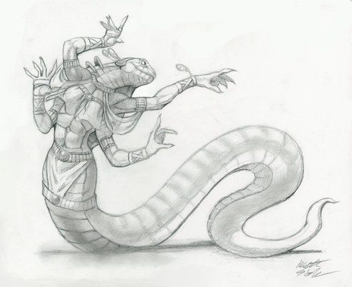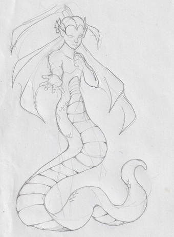 Another Naga, this one a little more snake like. This was spawned from a three hour class in social psychology. Naturally the scanner has gone and butchered the details. I'll make an effort to find a better scanner, or a program that will allow me make adjustments to shading. Until then, enjoy.Oh, and her name is Ru.