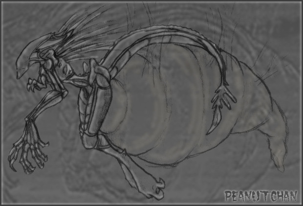 Amenii cupped her belly nervously, the squirming had intensified over the last few days. ‘Oooh, calm down… and go to sleep… just go to sleep…Ah! And stop squirming!’ Hands still cupping her swollen abdomen she tried to avoid looking at the wriggling serpents in her belly.A sharp clicking hiss came from behind her, announcing the monster’s presence before she could even see it. It would not harm her, she had figured that out long ago. No, not while their spawn still grew within her. They would guard her, protect her with their lives, bring her food, or at least try too, the aliens understanding of nutrition was vague at best. Even though she had showed them a ration pack time and time again, they still brought her anything that seemed to be protein based.
