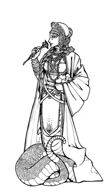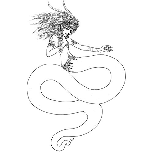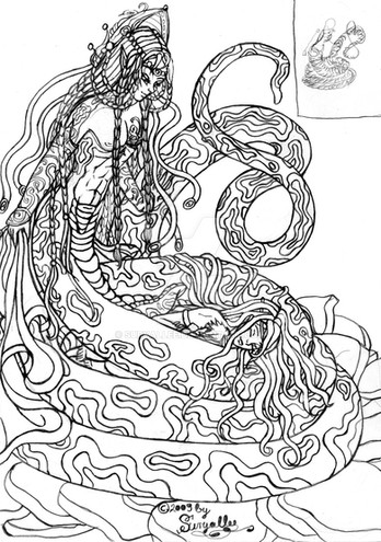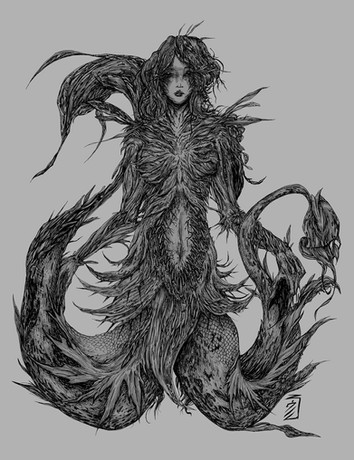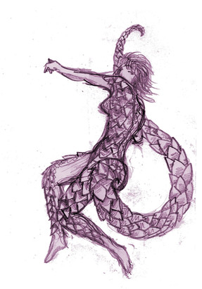 Ru, a combination of plant, snake, and human. Mostly Naga, but also half plant. She was born of me trying to put off what I should be working on. A friend found a few old roll playing books from the world of darkness, the art was inspirational and thatβs where this piece came from.