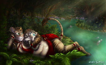 Amenii and Nera seem to be enjoying themselves at a lovey water garden, and swimming pool.C.S. Notes: This lovey piece is a commission, created by Thank you for the wonderful job.