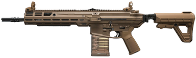 Textron NGSW-R assault rifle is broadly based on the research and development work, done by AAI during the LSAT program. It uses gas operated action with vertically moving cartridge chamber. Fresh rounds are loaded into the chamber from the rear, empty cases are pushed forward from the chamber by next rounds, and then ejected out of the gun to the right. Loading and ejection is performed while chamber is lowered from firing to loading position by special cam tracks, attached to the operating slide, which reciprocates back and forth behind the breech part of the barrel. Slide is powered by gas piston, located above the barrel. Rearward movement of the slide cocks the hammer and lowers the chamber for reloading; return (forward) movement of the slide is powered by a return spring, located in the butt; it allows the loaded chamber to rise under pressure of its lift springs until it is aligned with the bore, so gun can be fired, and then the cycle repeats itself. Ejection port is positioned on the left, well in front of the magazine, and raises some concerns about possibilities of it being blocked by a left hand of the operator. Ejection port has spring-loaded dust cover. Ammunition is fed from 20-round box magazines, made from plastic, and barrel is normally fitted with specially designed sound suppressor. All sights are installed using integrated Picatinny rail located on the top of receiver and forend.