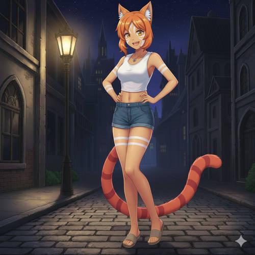 Bio: Amanda, or better known as Mandy, is just an adorable kitty-girl with a LOVE for tickling other girls~! Unlike Ari, she takes the love in being the tickler, not the ticklee. Mandy loves pinning an adorable girl with a cute tummy and tickling her senseless~! One of her favorite tickling techniques is to pin a girl down, then brush against her tummy with her big, fluffy tail~! She's probably one of the most playful and mischievous ticklers out there~! Mandy actually gets so into the tickling that she can't stop herself sometimes! When it comes to Mandy being tickled, she's not a fan. She'd only be the one tickled if she was really getting into a relationship with the girl, and she's pretty ticklish herself~! Many doesn't only love tickling. She has other hobbies like sports and maybe a few Nintendo games, although she's probably spending most of her free time finding a new cutie to tickle. Oh~! She also has a pretty big sweet tooth, and will do anything for some candy~!