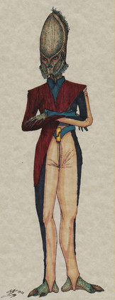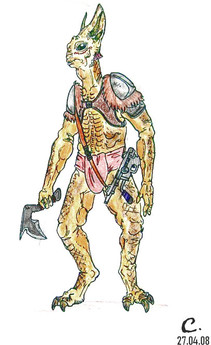 Lone hunters who face challenges as a rite of passage on alien worlds. Some of the reference art shows them to be ludicrously muscular, but this one is merely enormously muscular. They were created by Patrick Bouquet and Chrisophe Debien for an article in the Cassus Belli magazine.Related content