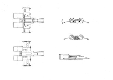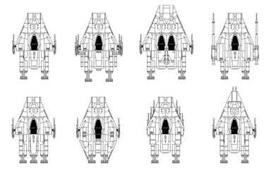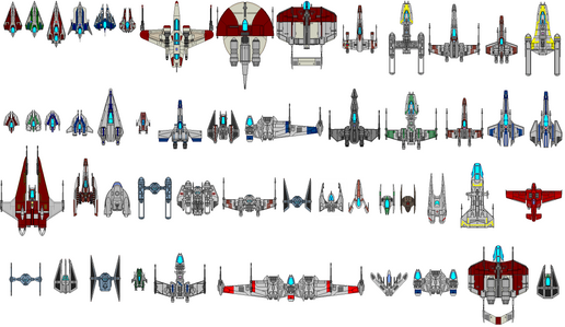 More basic wire-frames, this time for four fighters from the expanded universe. Starting from the top left and going clockwise, we have the Cutlass-9, Headhunter, the Mankvim-814 and the Cloakshape. All the fighters are now in correct proportion with each-other. I was surprised to discover the Headhunter is so much bigger than the X-Wing.And I added the Kihraxz fighter (just to the right of the Headhunter) which is used by Black Sun pilots, and below that the M-3A Interceptor, which anyone who has played Star Wars Galaxies is very familiar with.