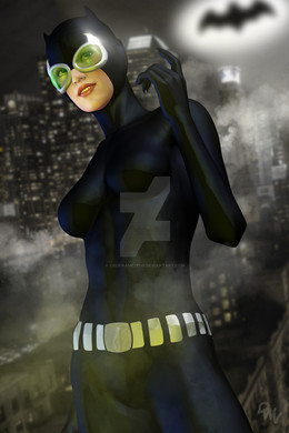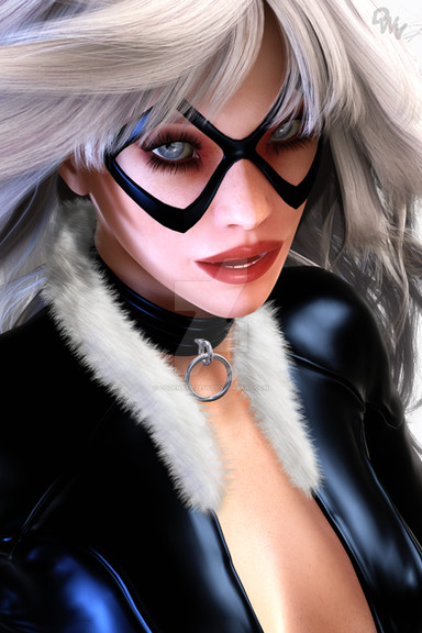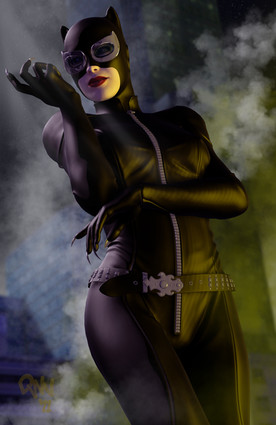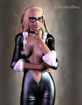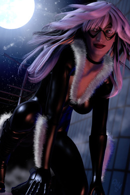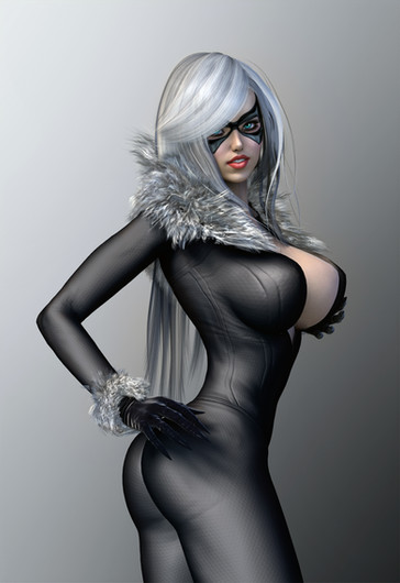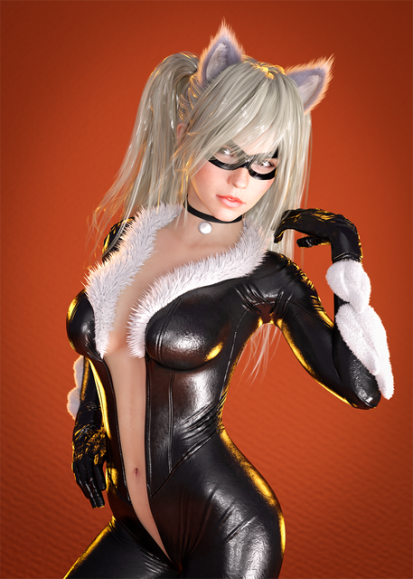 Gorgeous image and I love the lighting detail for her black, leathery costume. The texturing looks amazing and realistic. Love the soft fur lining on her arms and bodysuit. Her hair looks soft enough a puff of wind could move it slighty.