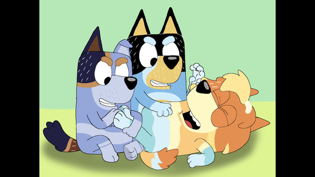 Bandit Tickled by his Wife Chilli and Daughters Bluey and Bingo from the Episode Blue MountainsRelated content