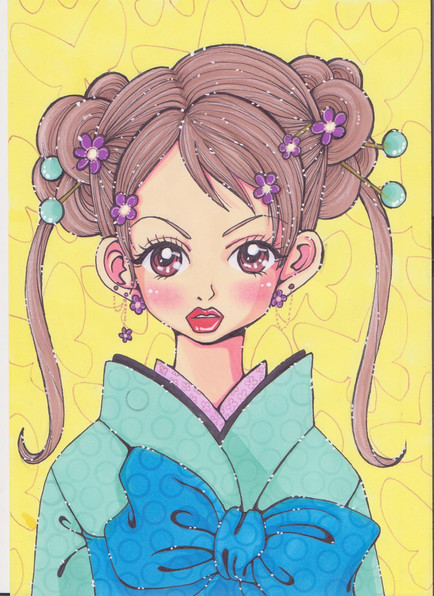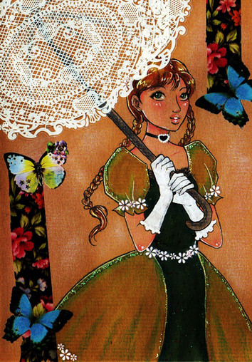 the dress are made of gift-wrappers. I used Colleen colored pencils for the hair, face and leaves.