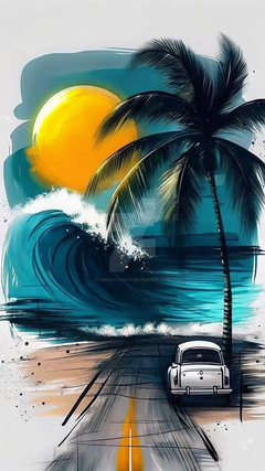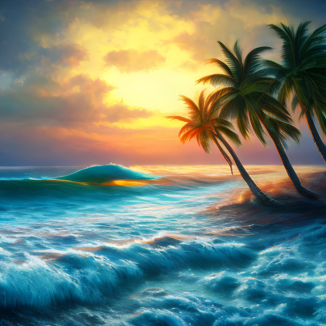 #background #beach #coconuttree #digitalart #digitalillustration #evening #orangeyellow #sunlight #sunset #goldehour #oilpaintingstyle
