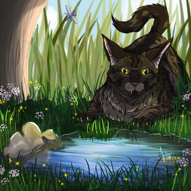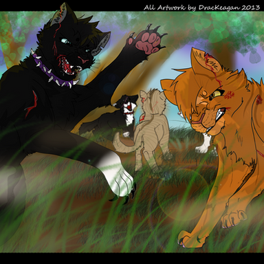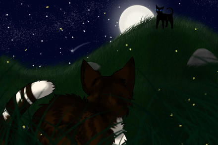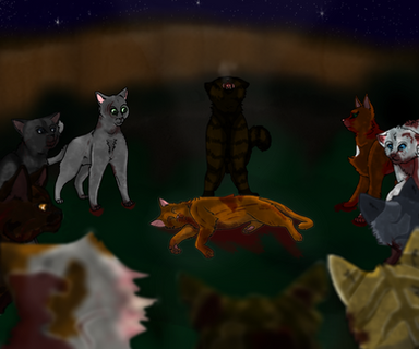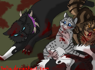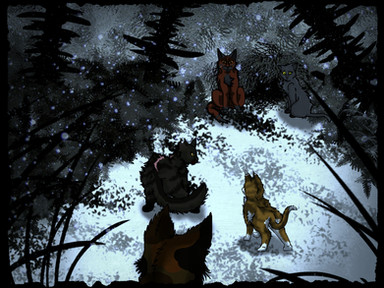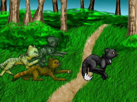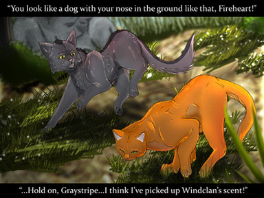 Oh silly Graypaw. So, if you guessed, from left to right is Firepaw, Graypaw, and Tigerclaw, and front and center there is Sandpaw demonstrating the hunting crouch. And of course, goodie-twoshoes Firepaw is actually paying attention. Ugh.