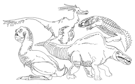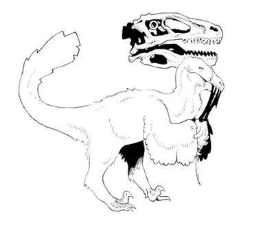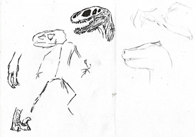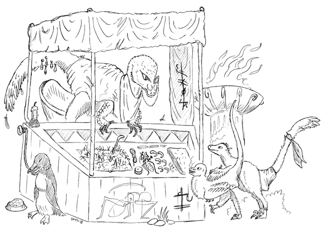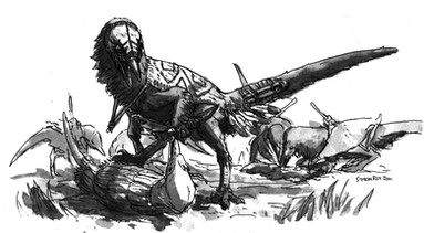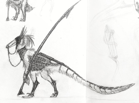 A doodle of an intelligent dinosaur person. Based on the ensemble he or she has donned it can probably be assumed that the local environment is wild(ish) and the locals are not the most technologically advanced.The metallurgy present on the headdress for example was likely a lavishing import.