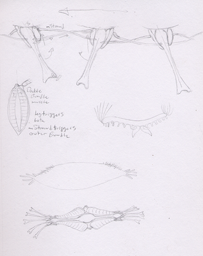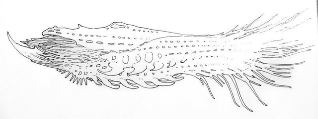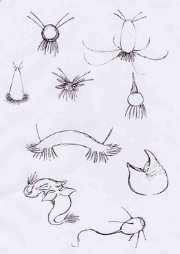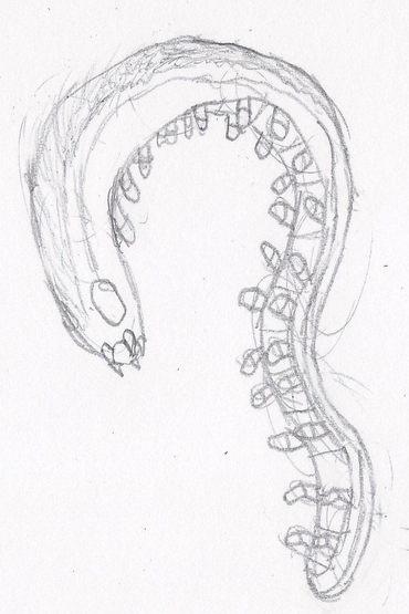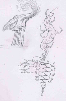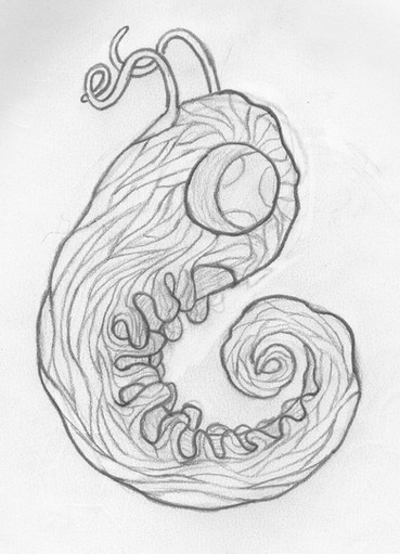 The Hookworm spends it's entire life inside the Owlqueen, it lost it's ability to perform photosynthesis and now feeds completely off of it's host. The poison glands now produce a silk-like substance that becomes a sheet or slate when released. It's eyes became the organs used for releasing the 'silk' so the Hookworm is now blind. It normally has five hooks, the massive sporoid hook which is used for feeding and reproduction, two thick hooks directly behind it (cannot move), one longer thin hook behind that (movable), and a double hook on the end of it's tail. The gill opening has moved inwards, so the gill opens on both sides now, although the gill works the Hookworm gets most oxygen from the Owlqueen blood it consumes. Because of damage to the gills, loss of blood, and other things caused by the parasites, Owlqueens eventually die when infected.