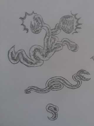 Some Parasitic Noxis attacked a Neon Spectrum hanging around the entrance to the GTD, it swam up into the GTD, and released a bunch of Noxis that spread havoc and death. From there the Noxis were brought up into the Twilight River by some Vespa. Because they couldn't fight the river current they began living in Owlqueen fry-chambers, infecting fry and Eelkings, eventually killing the hives through underpopulation, poisoning, and starvation. They would spread during raids, being carried by Wasplings in clumps of fry and other flesh. Eventually the Noxis started infecting the Owlqueen herself, they also began taking in blood and halting photosynthesis. The most delicate spot nearest to the fry-chamber were the gills of the Owlqueen, so that's where new Noxis would escape her body. Over time the Noxis developed several more spikes for better grip to the walls of the fry-chamber, less streamlined and a whip-like tail from not needing to swim long distances. Finally they stopped producing poison, which harmed their host and slowly ruined the blood, and began producing sheet-silk to protect against being bumped by other residents of the fry-chamber, they would excrete the sheet-silk from their eyes and thus, they went blind.