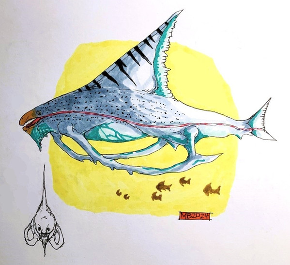 vicious little thing... very fast, big fins for sharp turns, electro sensors(or whatever they're called) on the first six segments... tentacles closer to the body, more aerodynamic etc... very little photosynthesis used for getting energy, virtually all energy is obtained from it's prey.... mouth spike can shoot out and stab instead of relying on digging into prey after grabbing it, or ramming into prey...