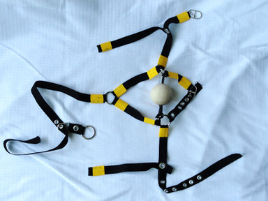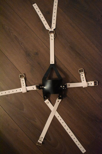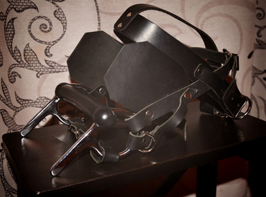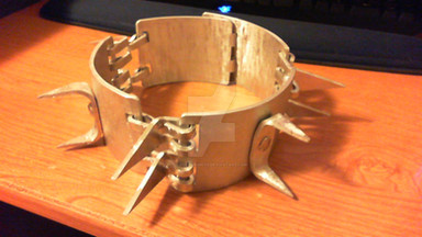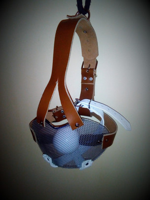 Leather, steel, plastic. This began life as a dog collar, a leather seat cushion, and an air hockey paddle.Related content