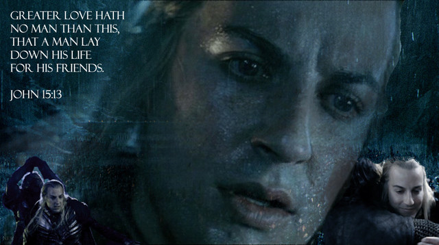 I sketched this for my best friend's birthday. It's based on the scene from Lord of the Rings: The Two Towers, in which Legolas returns to Aragorn the Evenstar, which he lost falling off that cliff...Lord of the Rings belongs to New Line/Peter Jackson, etc. etc. Don't sue me...please...?