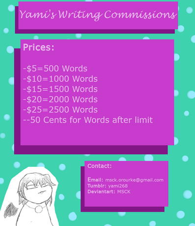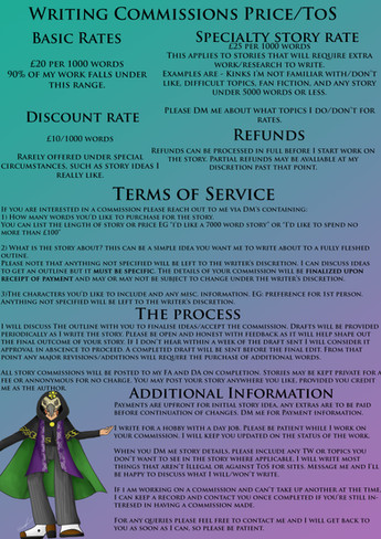 I am now doing writing commissions.For examples of my work please look here: archiveofourown.org/users/The_…