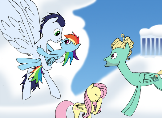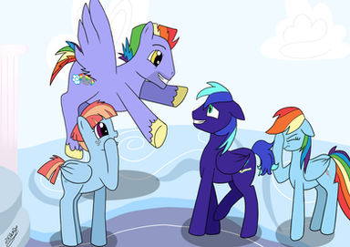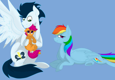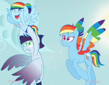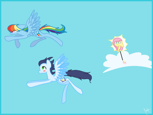 This is little filly Dashie flying for the first time with her parents(I accept the head cannon that Firefly is Rainbow Dash's mother)I think I got the cutie mark for her dad wrong, I wasn't able to see it in Games Ponies Play.Oh, an done more thing.....