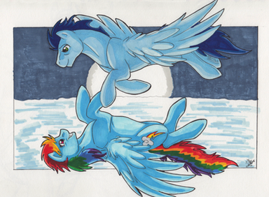 IF YOU DON'T WANT TO BE SPOILED..............wait, does this pic count as a spoiler........better safe than sorry DON'T READ.From chapt. 144 of Piercing the Heavens. Soarin' stepping up, protecting his girl, and being a complete badass while doing so. I don't think I was 100% accurate when it came to this scene. I was drawing this based off memory, and I couldn't remember if Soarin' had any scratches on him, but I put them on him anyway, and as you can see, the glow to his horn and eyes isn't there. No matter how many ways I added the glow in I just couldn't get it right. But, hey I shouldn't complain, at least the pic looks pretty.