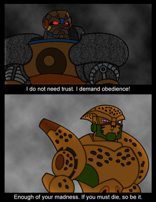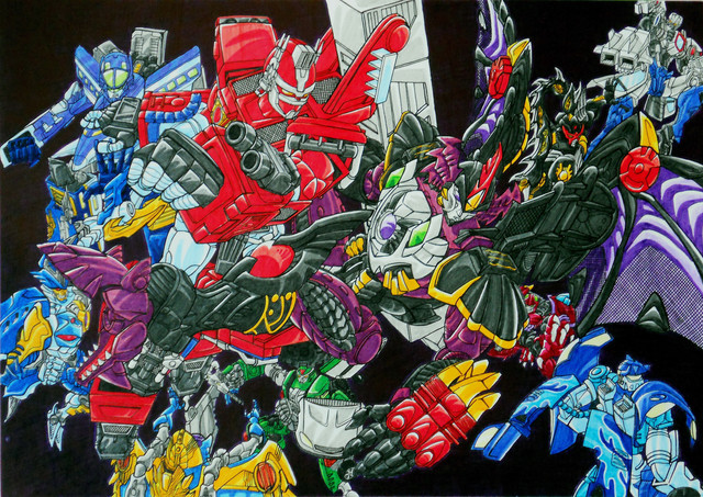 in the red corner, comprised of 6 transforming mecha that turn into "monsters" and hide in giant shells, monstructorin the blue corner, comprised of 6 transforming mecha that turn into monsterous machines, monsterous