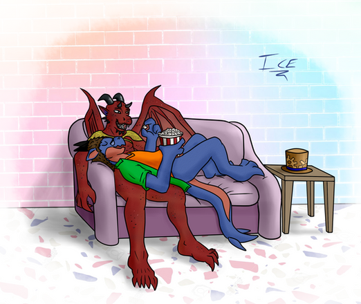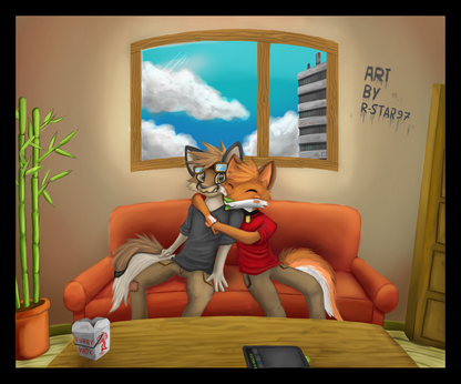 This is a commission from who wanted his aliensona and the fursona from SodiePawp being cuddled up on a sofa. I must say for drawing an alien and an anthro rabbit for the first time, I think it turned out rather decent.