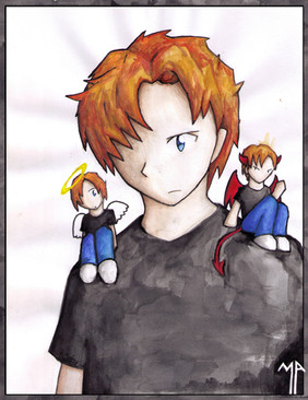 A little devil with a pimp hat and. Horns that looks like me goes to my side*