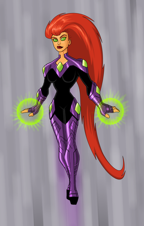 This design is great. She's sexy, yet looks powerful. She actually looks like a princess as well, instead of an intergalactic harlot. The outfit even has the essence of an alien design, of which isn't too easy to do while keeping the character "Starfire". However, I personally enjoy when her hair flows into flames. I see the colors present but not the actual metamorphosis into flame and I was wondering if that was intentionally avoided? It doesn't make me dislike the design at all; I was just curious because it is one of those, i suppose the word to best fit, nostalgic aspects of that i'm rather fond of.