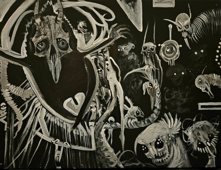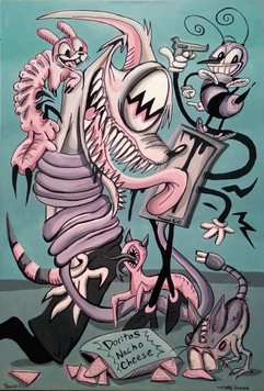 Painting-wise, you might notice some colors being mixed into my grays...I've been slowly trying to incorporate purple, greens, and blue-grays to accent things like tongues and flesh and different skins. Kind of like that pink "Joe" painting, but not so harsh and saturated. My newer paintings go even a little farther on the colored grays than this one does.