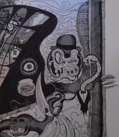 In this scene the person is in a wrapped cocoon-like skin and getting transformed into a lifeless drone. One demon puts a mask on it (similar to their own, as means of conformity), while the big one licks its gashes. The spectators on the top are all here to cheer and celebrate this "killing". One cuts his wrists and gives blood to the concept (with an evil bird having a drink ;] . The other is relieving himself. The next one is offering money like a person would to a cheering stripper....note: he’s actually an advanced-grown form of one of the abortion bear/bug babies’ lol, being a parasite in hell :>