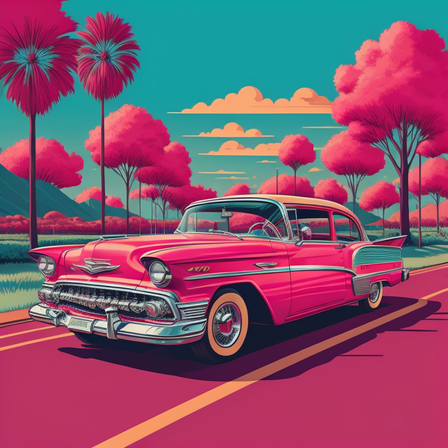#artdigital #artwork #car #digitalart #digitalpainting #fantasy #fantasyart #illustration #oldcar #pink #pinkcar #rainbow #retro #road #vintage #vintagecar #vintagestyle #retrovintage #aiart #patreon #aiartcomunity #cadillac