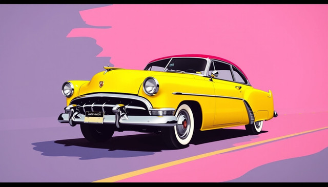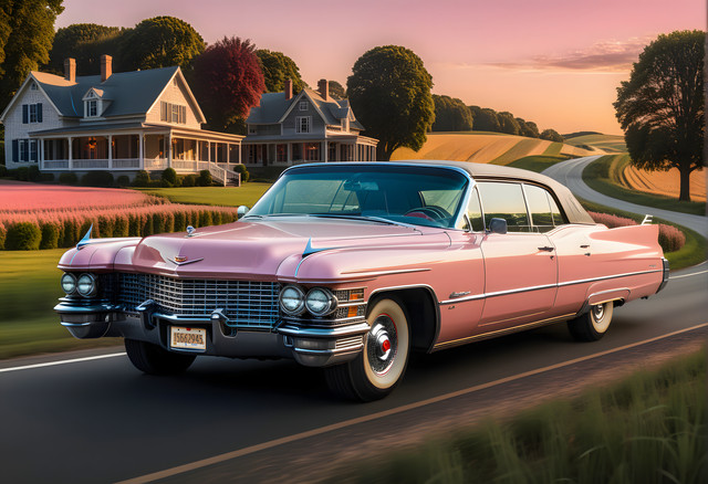 #artdigital #artwork #car #digitalart #digitalpainting #fantasy #fantasyart #illustration #pink #pinkcar #aiart #patreon #aiartcomunity #oldcar #rainbow #retro #road #vintage #vintagecar #vintagestyle #retrovintage