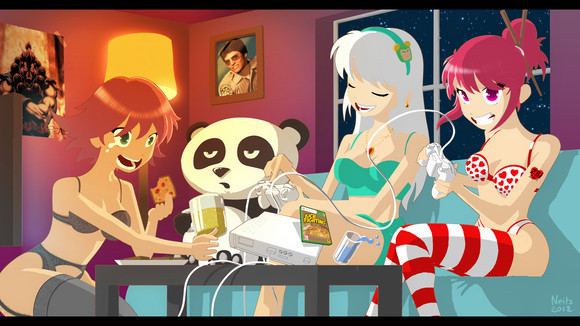 That's what I'd like to come home to. 4 hot gamer girls!! Only thing that would make this better is if they were playing a game where the loser stripped