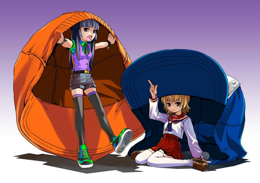 When I first looked at this I thought the green bean bag was a snake tail belonging to the red head. I like this picture. But, I am a little disappointed to realize that this picture has no monster girls doing everyday stuff.