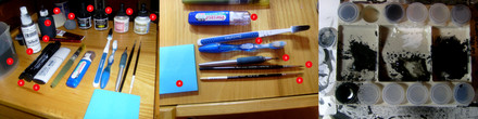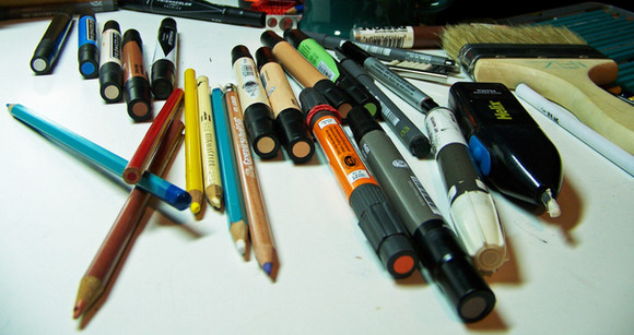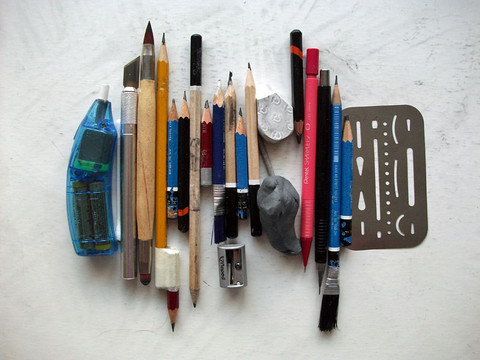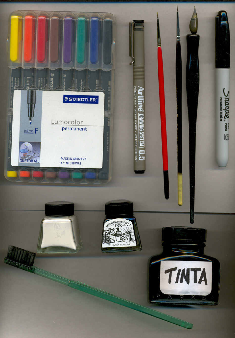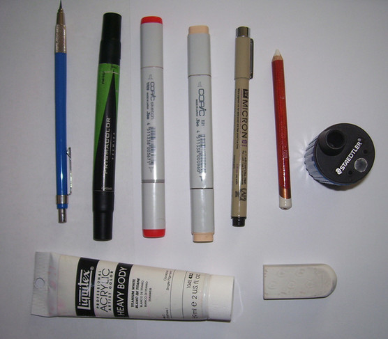 Scotch Tape, Manga black ink, white poster color, Super white ink, kneaded eraser, Rubber eraserm, Clips, Brush Pen, G-pen, Round pen, Spoon Pen, Fine Brush, Used China Brush, Cutter (small), F pencil, Blue Pencil, Auto eraser, Drawing Pens ( .1 - .5 ), Caligraphy pens, White Marker, Cutter ( large ), light box