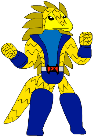 Appeared in Episode 28 of Desert Squadron: Saharanger.The alias of Ryan Beamsly. After getting upset with others critizizing his constant tanning, he was found by D-Light, who promissed to help him. He then gained the power to shoot heat waves from his armor, heating up the area around. He can also shoot beams of light to blind opponents. He is based on a tanning bed themed monster called Hiyake, created by Wobbley .
