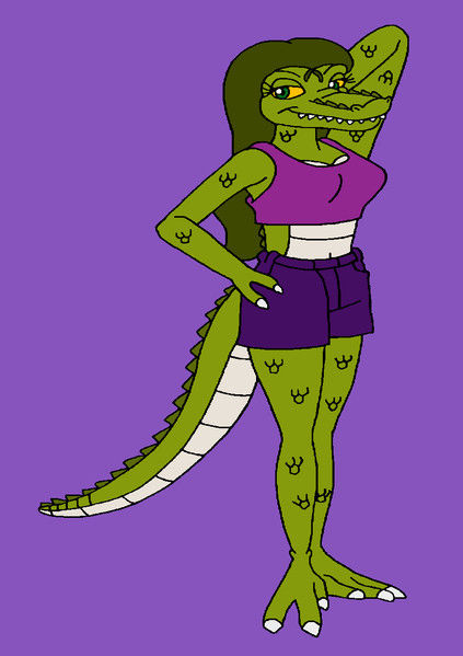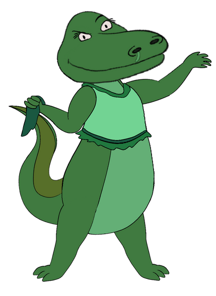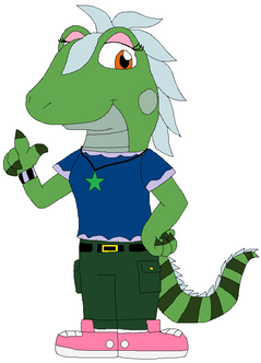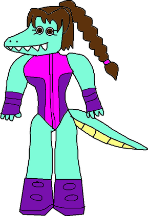 First appeared in Episode 21 of Desert Squadron: Saharanger.She is an alligator who runs a shoe store in Bangle City. Her specialty is high heels and creates custom-made ones to sell. She is always seen wearing a pair of them.
