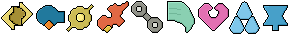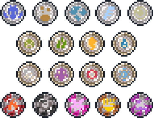 The Palworld Elements in the style of PICO-8.From left to right: Darkness, Grass, Electric, Water, Neural, Fire, Ice, Ground, Dragon.