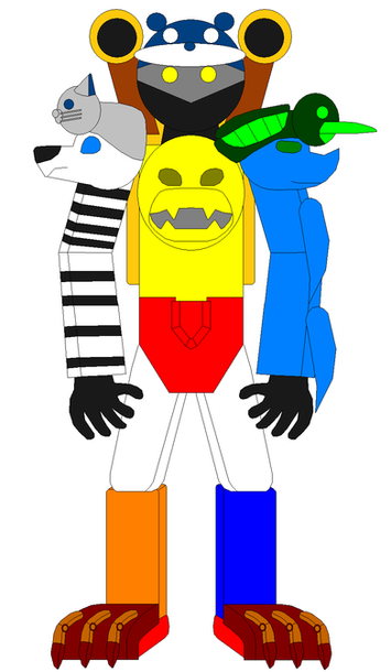The main Megazord for Desert Squadron: Saharangers. Black Falconzord forms the body and part of the wings, Red Jackalzord forms the legs, Blue Catzord forms the left arm, Yellow Lionzord form the right arm, and Green Ibiszord forms the head and rest of the wings. Its weapon is a giant ankh key that can turn into any of the core team's weapons; a shield, staff, blaster, sledgehammer, or scythe. Its finishing move is plunging the key into a glowing hole in its opponents chest after taking enough damage.Related content