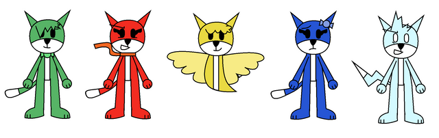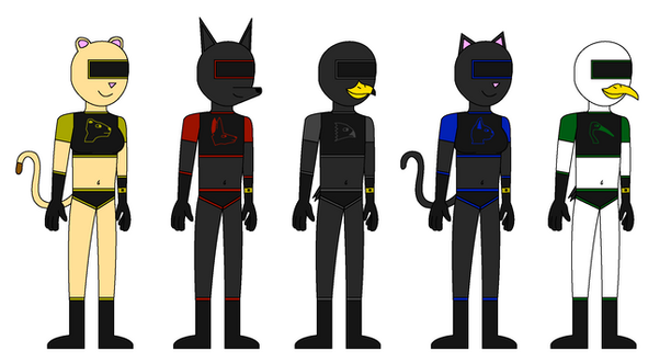 The Saharans in their Zero Suits. They are special bodysuits that can turn into any clothing the wearer scans. By inserting the Ankh Keys into the bracelets, the Zero Suits can morph into Plus Suits, giving the wearer durable armor. The name and design are based off the Metroid franchise.From left to Right: Sekhmet/Selma, Anubis/Aaron, Horus/Harold, Bast/Bea, Thoth/Thomas.