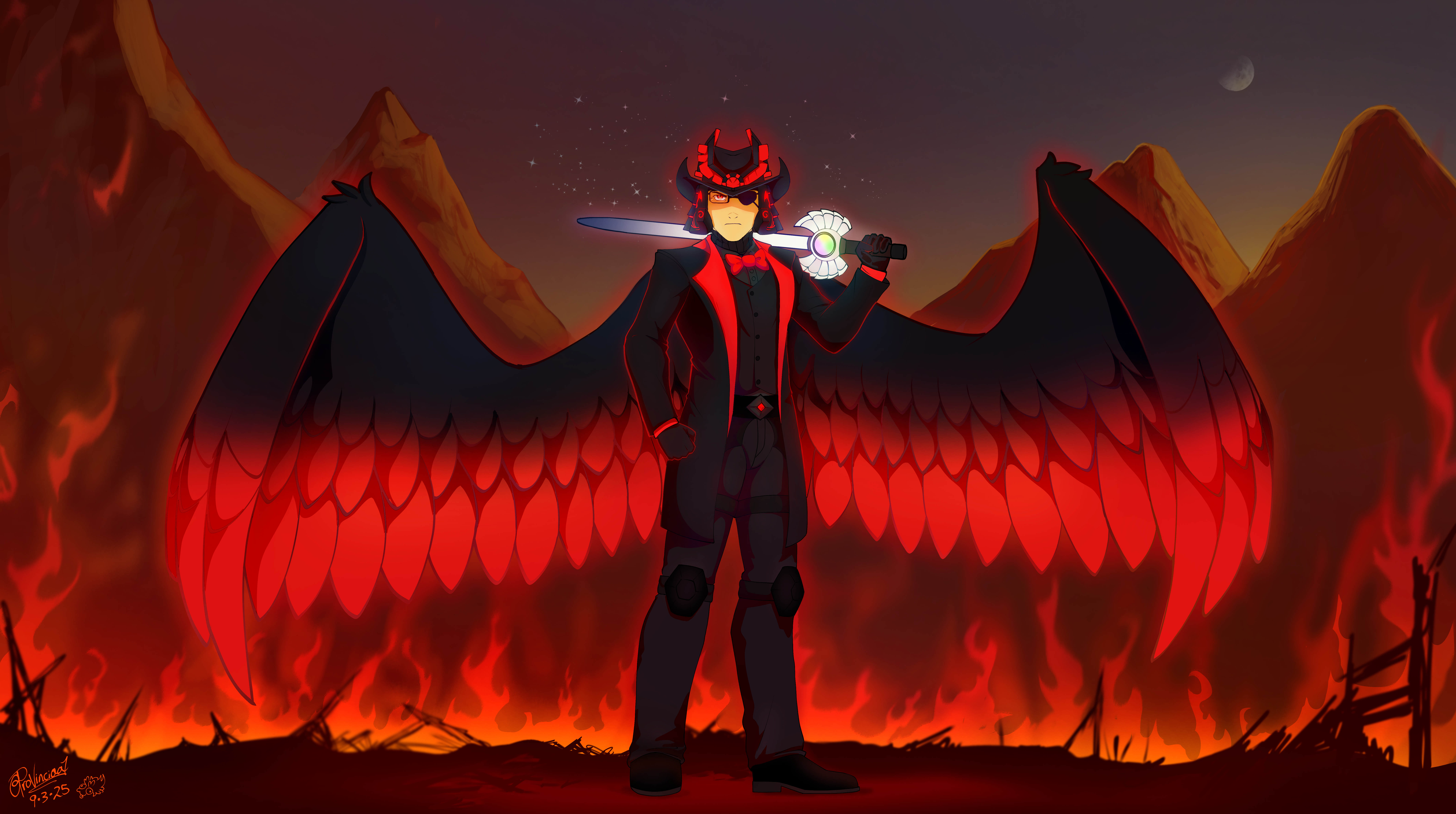 #black #blackandred #blackhair #commission #nephilim #red #weapons #wings #warglaives #allenravenix