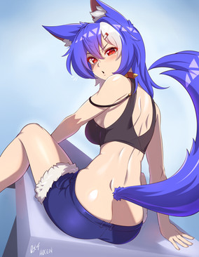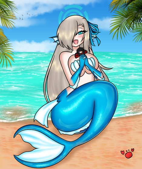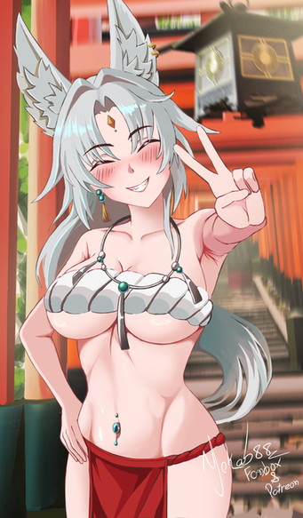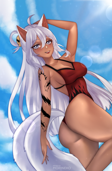 #fanart #catgirl #digitalart #blush #laying #necklace #nekomimi #sand #shorthair #swimsuit #tails #touhou #whitehair #beartraps #enokomitsugashira